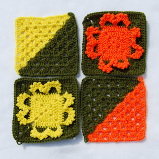 For my day 8 squares, I used a variation on the "Split in Two" grannies I made on day 7. This time around (pun intended), I made 8 small pieces and put them together to make a diamond. After all, everyone knows that a diamond is a granny's best friend!